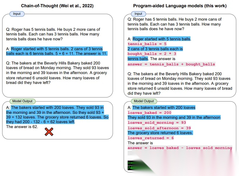 Gao等人(2022)PAL: Program-aided Language Models提出了一种方法,使用大语言模型读取自然语言问题,并生成程序作为中间推理步骤。这种方法被称为程序辅助语言模型(PAL),它与思维链提示的不同之处在于,它不是使用自由形式的文本获取解决方案,而是将解决方案步骤交给诸如Python解释器这样的程序运行时处理。