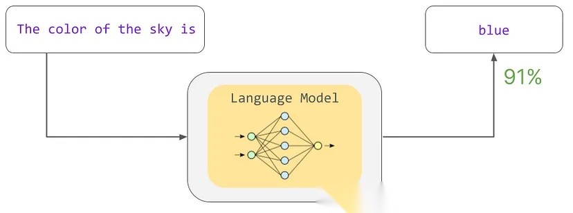 语言模型可以根据其在训练过程中学习到的统计模式,预测最可能跟随某个短语的单词(或多个单词)。在图中,语言模型可能会估计“天空的颜色是”这个短语后面跟着“蓝色”一词的概率为91%。