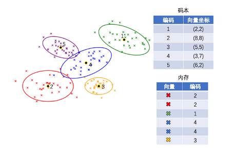 上面我们介绍了两种牺牲搜索质量来提高搜索速度的方法,但除了搜索速度外,内存开销也是一个巨大挑战。在实际应用场景中,每个向量往往都有上千个维度,数据数量可达上亿。每条数据都对应着一个实际的的信息,因此不可能删除数据来减少内存开销,那唯一的选择只能是把每个数据本身大小缩减。有一种乘积量化的方法可以帮我们完成这点。图像有一种有损压缩的方法是把一个像素周围的几个像素合并,来减少需要储存的信息。同样我们可以在聚类的方法之上改进一下,用每个簇的中心点来代替簇中的数据点。虽然这样我们会丢失向量的具体值信息,但考虑到聚类中心点和簇中向量相关程度,再加上可以不断增加簇的数量来减少信息损失,所以很大程度上我们可以保留原始点的信息。而这样做带来的好处是十分可观的。如果我们给这些中心点编码,我们就可以用单个数字储存一个向量来减少存储的空间。而我们把每个中心向量值和他的编码值记录下来形成一个码本,这样每次使用某个向量的时候,我们只需用他的编码值通过码本找到对应的的中心向量的具体值,虽然这个向量已经不再是当初的样子了,但就像上面所说,问题不大。而这个把向量用其所在的簇中心点表示的过程就是量化。