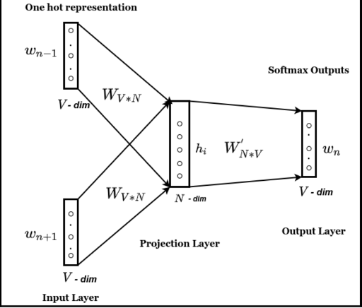 - 接下来,将每个one-hot向量与一个大小为V×N的权重矩阵W相乘(这里V是词汇表的大小,N是词向量的维度),得到每个单词的词向量。然后,将所有这些词向量加起来并求平均,得到代表整个句子上下文的向量e(即图中的projection layer中的1×N向量)。