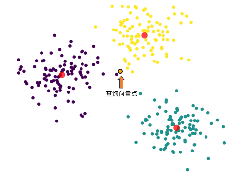 想象一下,当我们在网上购物时,通常不会在所有商品中盲目搜索,而是会选择进入特定的商品分类,比如“电子产品”或“服饰”,在一个更加细分的范畴内寻找心仪的商品。这个能帮我们大大缩小搜索范围。同样这种思路,聚类算法可以帮我们实现这个范围的划定。就比如说我们可以用K-mean算法把向量分为数个簇,当用户进行查询的时候,我们只需找到距离查询向量最近的簇,然后再这个簇中进行搜索。当然聚类的方法并不保证一定正确,如下图,查询距离黄色簇的中心点更近,但实际上距离查询向量最近的,即最相似的点在紫色类。