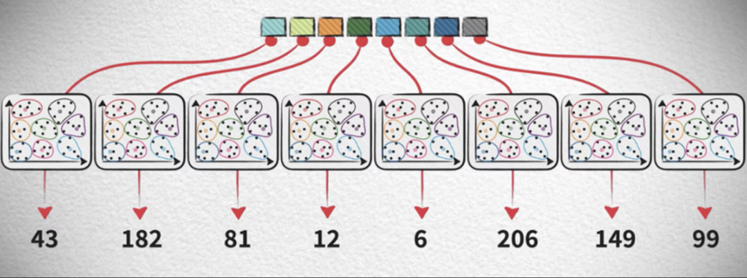 但是你可能会发现码本又引入了额外的开销。在真实的场景中因为维度爆炸的问题,更高的维度中数据分布更加稀疏,所以我们需要更多的聚类数量来减少丢失的细节,就比如一个128维的空间,我们需要2的64次方个聚类中心,所以最终这个码本所需的内存会变得非常恐怖,甚至超越量化本身所节省下来的内存。解决这个问题的办法是把高维的向量分割成多个低维的子向量,然后在这些低维的子向量中独立量化。比如把128维的向量分解成8个16维的子向量,然后独立的在8个独立的子空间进行量化形成自己子码本。