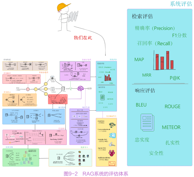 评估是度量RAG系统性能的重要手段。书中构建了全面的评估体系,评估数据集为测试提供基础素材,检索评估通过精确率、召回率等7种指标,度量系统从知识库中获取相关信息的能力。响应评估基于n-gram匹配、语义相似性等3类指标,判断生成回答的质量。