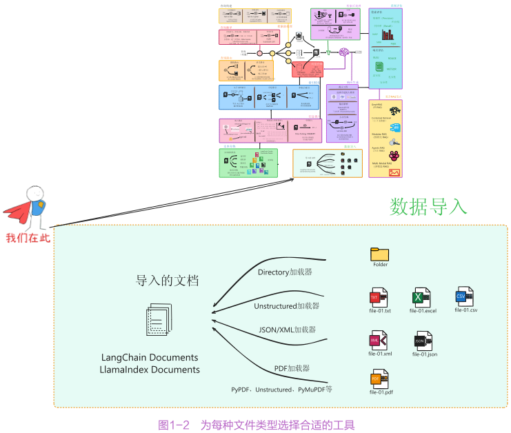 这部分是RAG技术落地的第一步。在数据导入环节,书中详细讲解了如何读取与解析多样化的文件格式,包括TXT文本、CSV文件、网页文档、Markdown文件、PDF文件等,还有借助Unstructured工具从图片中提取文字并导入。