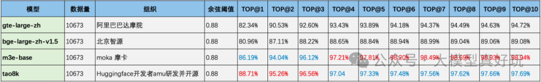 工作实践中我总结的对于中文环境下的Embedding Model 效果较好的有gte-large-zh, bge-large-zh-v1.5, m3e-base和tao8k,它们的具体效果如下图所示, TOP@n表示前n个结果中相关检索的正确性。