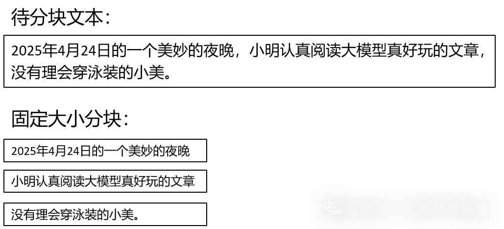 文本分块是决定检索质量的关键前置步骤。粗暴或不恰当的分块会导致信息丢失、上下文割裂、检索效率低下等问题,严重影响 RAG 系统的最终表现。然而目前大多数开源RAG系统采用的都是简单的直接按照固定字符数大小的切片策略,极易破坏语义的完整性。比如如下例子:通过固定窗口分块后,如果用户提问“小明什么时间阅读了大模型真好玩的文章?”,知识库检索到分块“小明认证阅读大模型真好玩的文章”和问题相近,但是并没有找到确切的时间,所以不会返回结果。