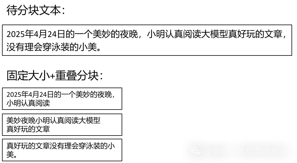 一些开源系统注意到了固定窗口切分存在的劣势,为了缓解在边界处强行切断语义的问题,通常会设置一个“重叠”(Overlap)大小。重叠部分意味着每个块的末尾会与下一个块的开头有一段重复的内容。