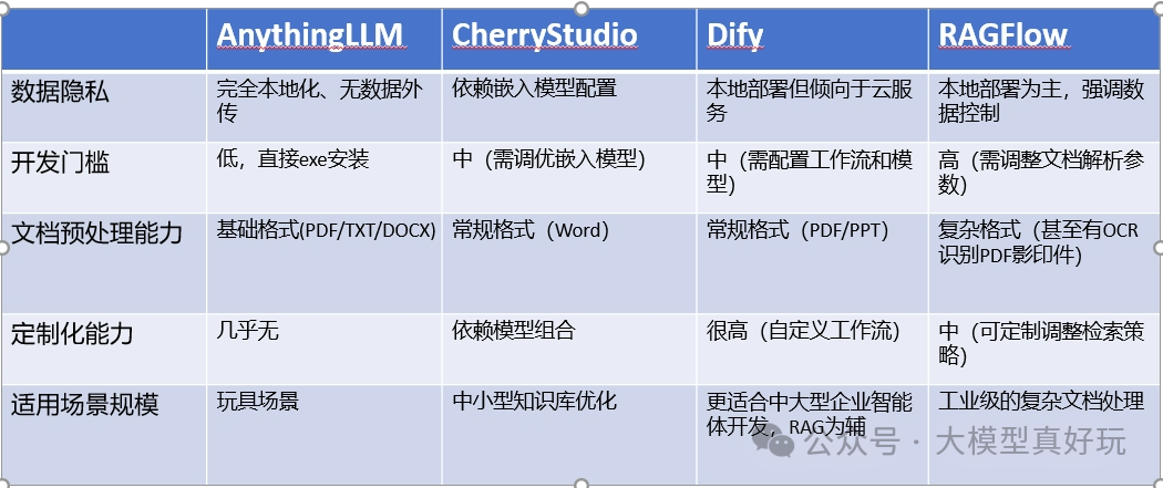 市面上RAG开源系统百花齐放,我们的首要任务就是要选择一款符合工作场景的RAG系统。结合日常工作经验,我对常见的四款开源框架AnythingLLM、Cherry Studio、RAGFlow和Dify从数据隐私保护、开发门槛、文档预处理能力、定制化能力和适用场景五个维度进行对比。综合来看我更推荐 RagFlow 作为大家首选,它支持扫描件/表格解析、文本切片可视化调整、多路召回优化答案准确性,甚至有回答索引高亮等用户友好功能。