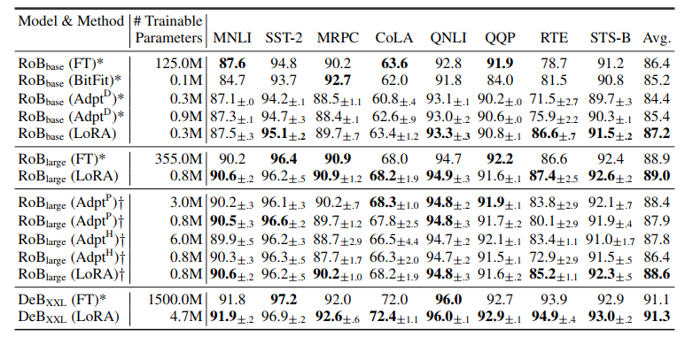 LoRA 在多个主流模型与任务上进行了系统验证,包括 RoBERTa、DeBERTa、GPT-2、GPT-3。