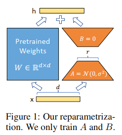 起始时,A 服从高斯分布初始化,B 初始化为零,使得 ΔW = 0。 整个模型在训练开始时与原始模型等价,随后逐步学习下游任务所需的细微方向调整。