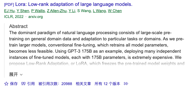 Lora: Low-rank adaptation of large language models,作为LLM领域的的‘古早’论文, 发表于机器学习顶会 ICLR 2022, 至今已经有20988 引用,对LLM微调部署产生了深远影响。
