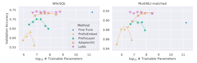 在 GPT-3 175B 上,LoRA 仅需 470 万个参数(约占原模型 0.003%),显存占用从 1.2 TB 降至 350 GB。 在 WikiSQL、MNLI、SAMSum 等任务上,LoRA 的性能不仅与全微调持平,甚至略有超越。