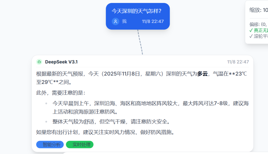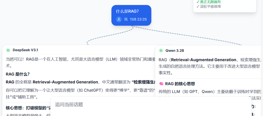 我采用的是画布形式,灵感来自flowith,比较有创意。可以在任何一个节点上继续提问。