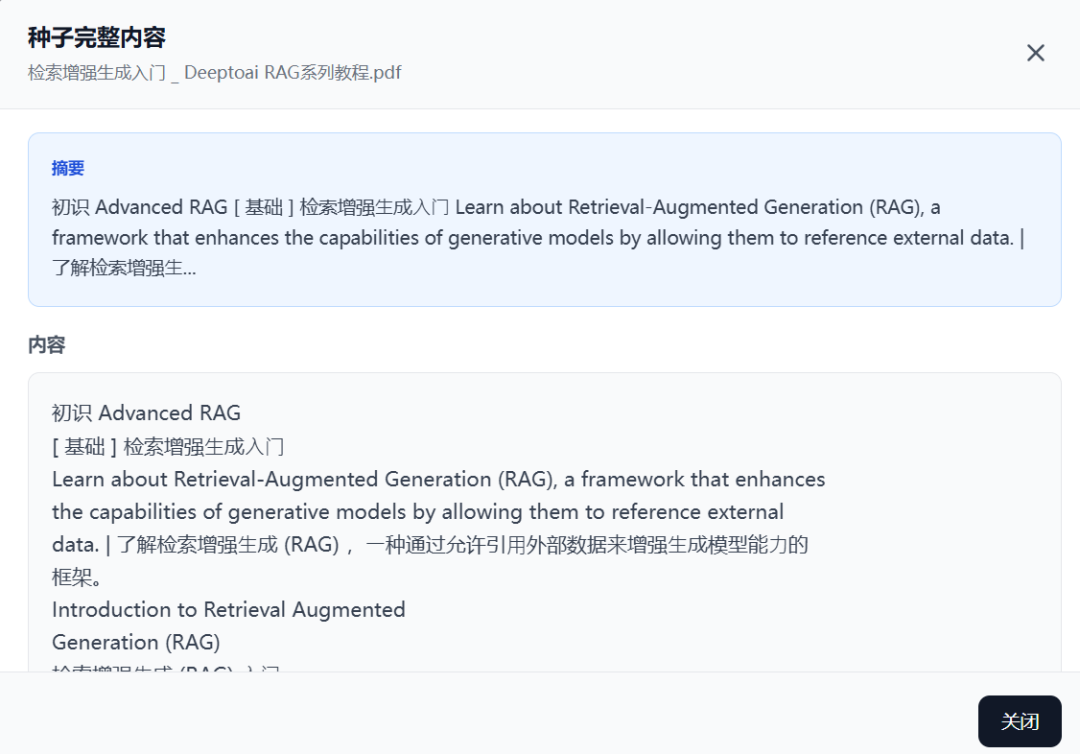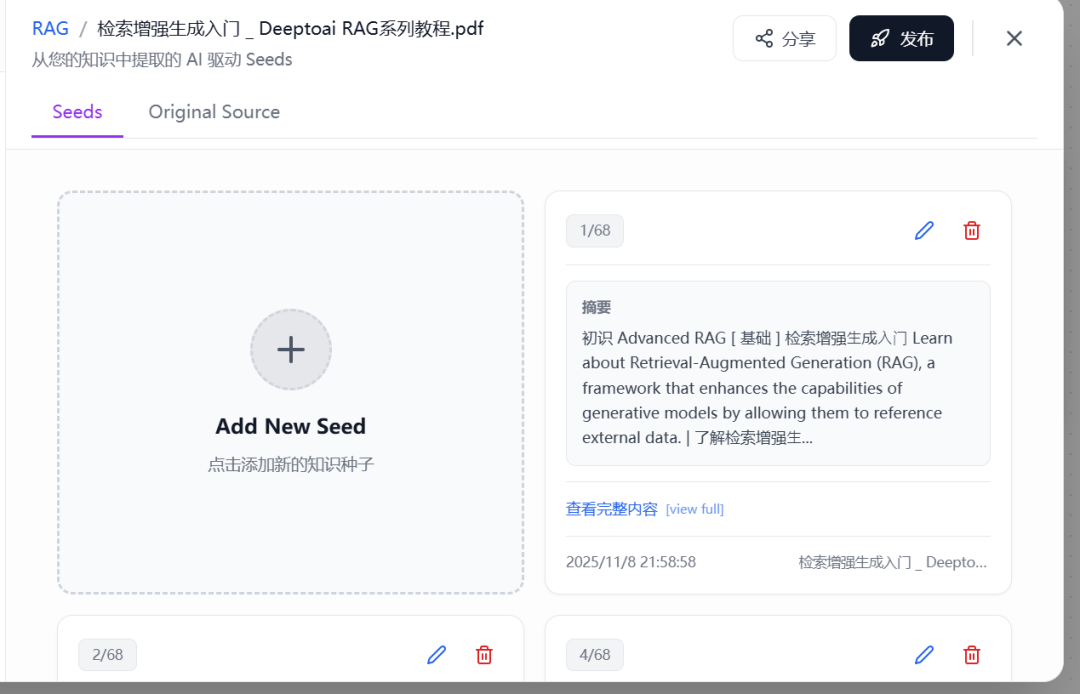 点击某个知识库分组,可以对上传的知识生成的种子进行预览,并对生成的种子的结果进行增、删、改,以提高种子质量,增强后续的检索结果。