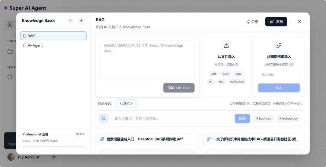 包括文本输入、文件导入、网页链接三种方式上传知识,然后通过文本切分,生成对应的知识种子。