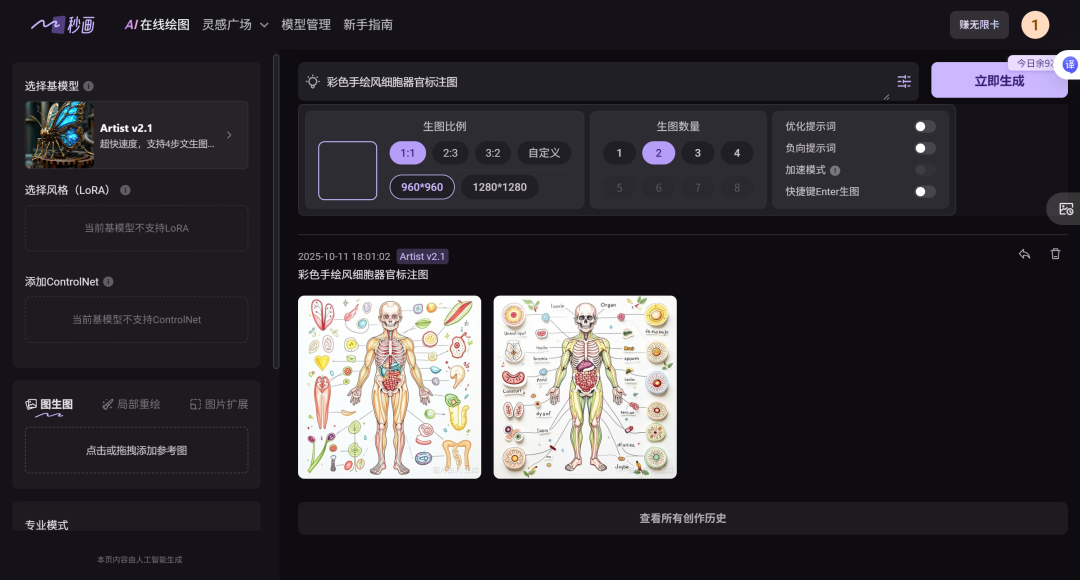 文图转换的“秒画”文生图模型参数量达百亿级,可生成电影级质感图像。讲解生物知识时,输入“彩色手绘风细胞器官标注图”;教授历史时,指令“水墨风格故宫角楼剖面图”,几秒即可生成高清配图,让复杂知识点更直观;讲授地理时,输入 “写实风板块运动示意图”,几秒即可生成高清配图,让复杂知识点更直观。