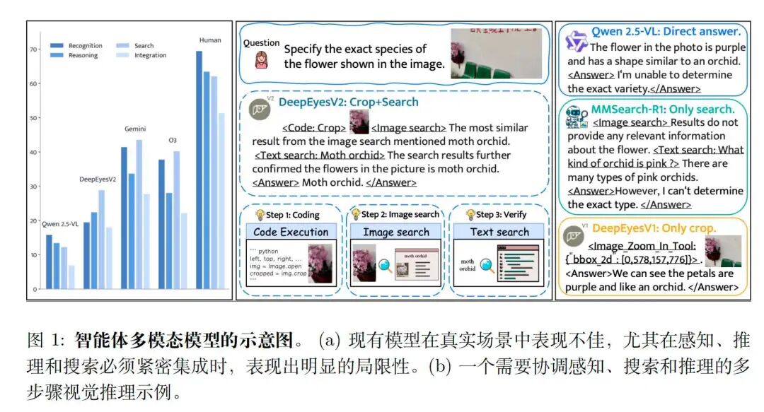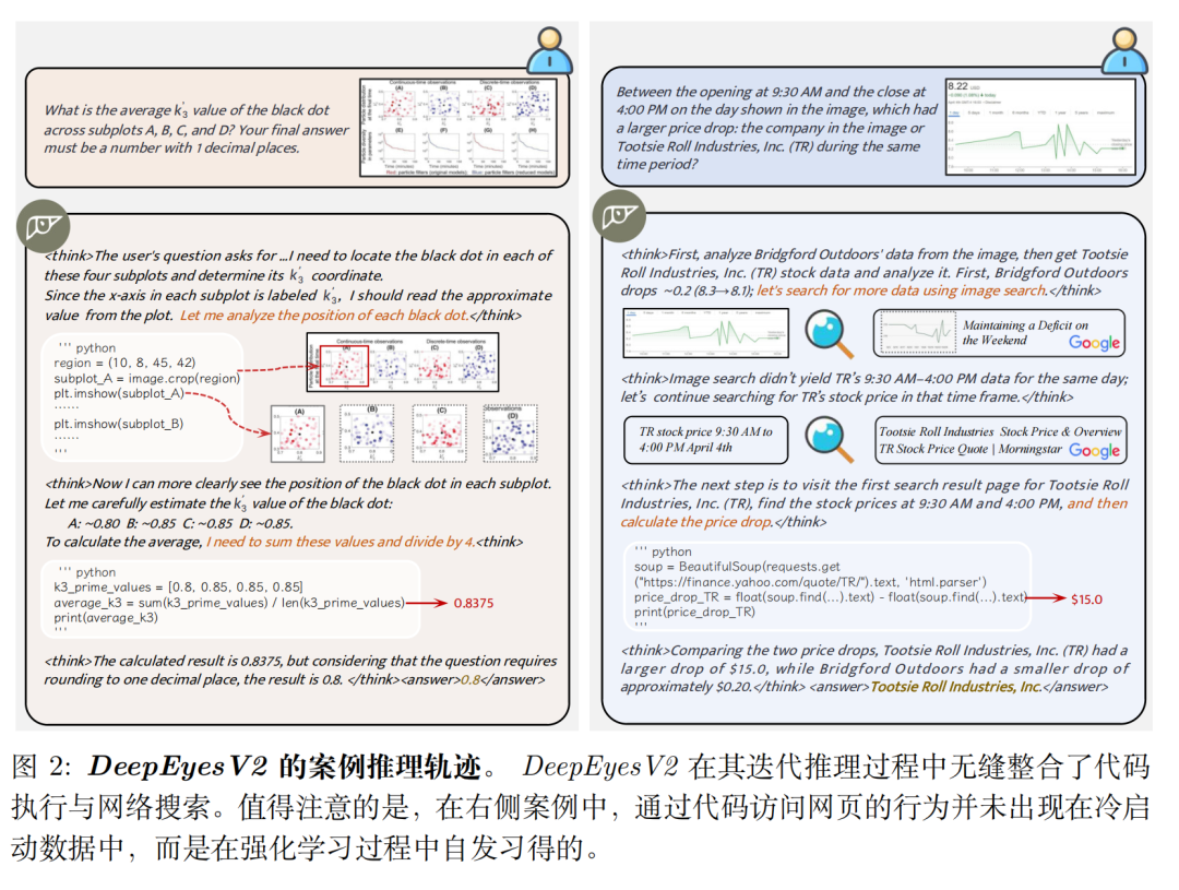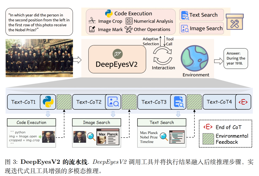 🧠 一句话总结:这篇论文聚焦 “Agentic 多模态大模型” 的核心突破,提出了能主动调用工具、动态整合推理的 DeepEyesV2。DeepEyesV2 通过 “冷启动微调 + 强化学习” 两阶段训练,整合代码执行、网页搜索等工具,实现了感知、搜索、推理的跨能力协同,在真实世界理解、数学推理、搜索密集型任务中表现远超现有模型,为智能体化多模态模型的构建提供了完整方案。