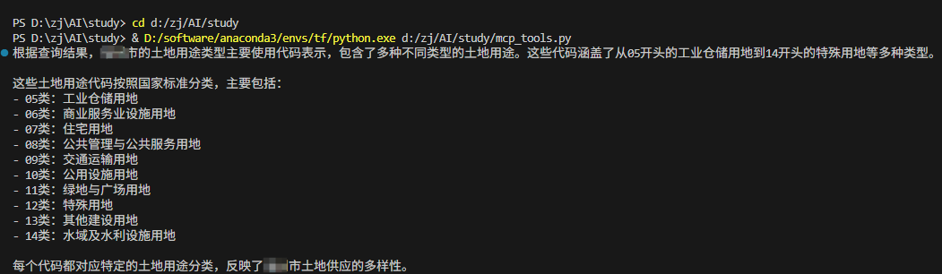 这里我有一个Postgresql数据库表,存储是某市的供地信息,使用MCP查询数据库,并返回结果,代码如下: