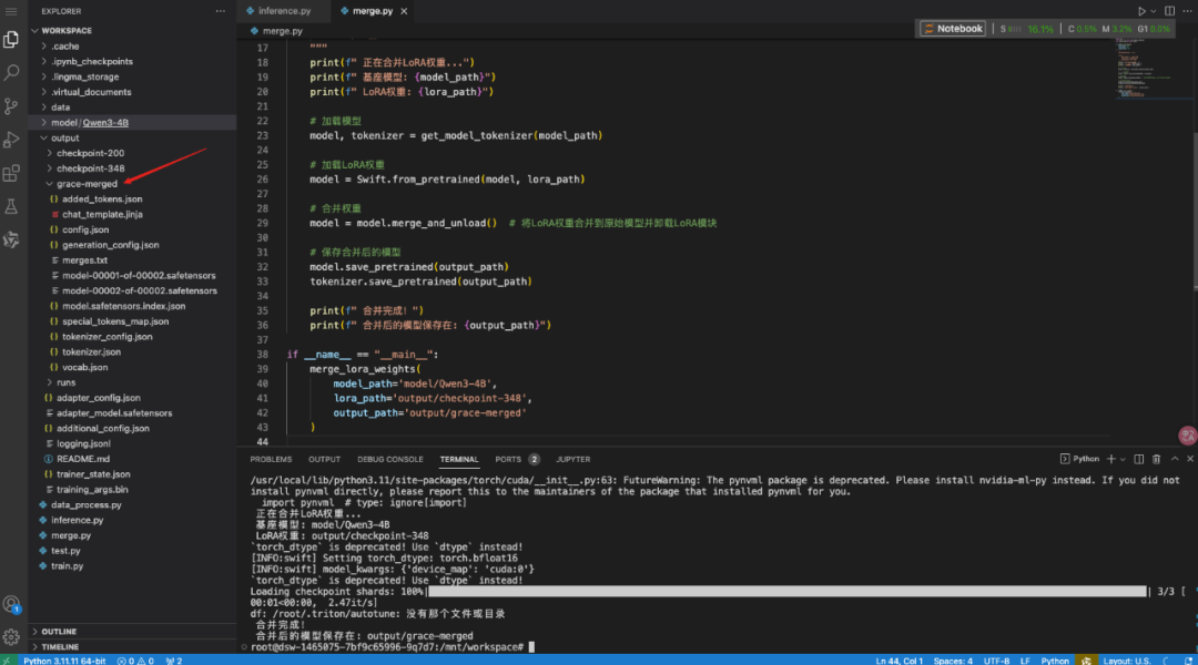 如果你想将LoRA权重合并到基座模型中,创建 merge_lora.py: