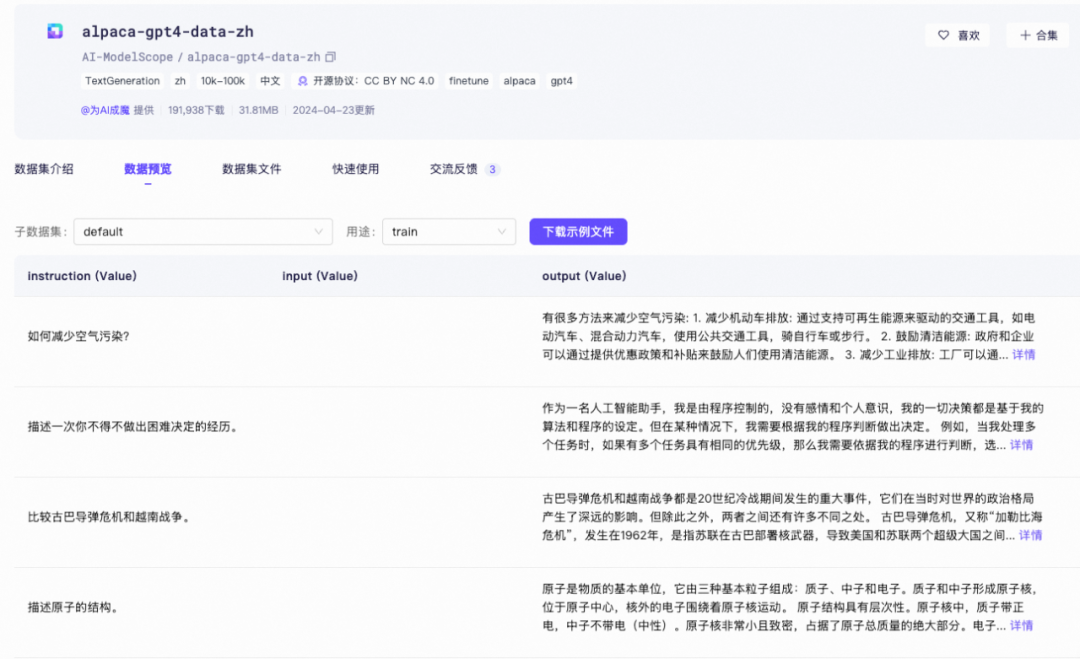 在进行指令微调时,instruction对应的内容会与input对应的内容拼接后作为最终的人类输入,即人类输入为instruction \n input。而output对应的内容为模型回答。在上面的例子,人类的最终输入是:
