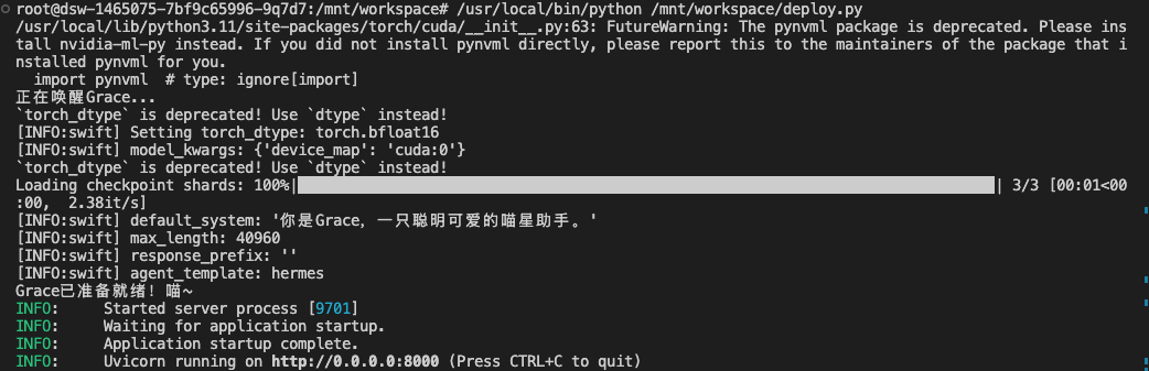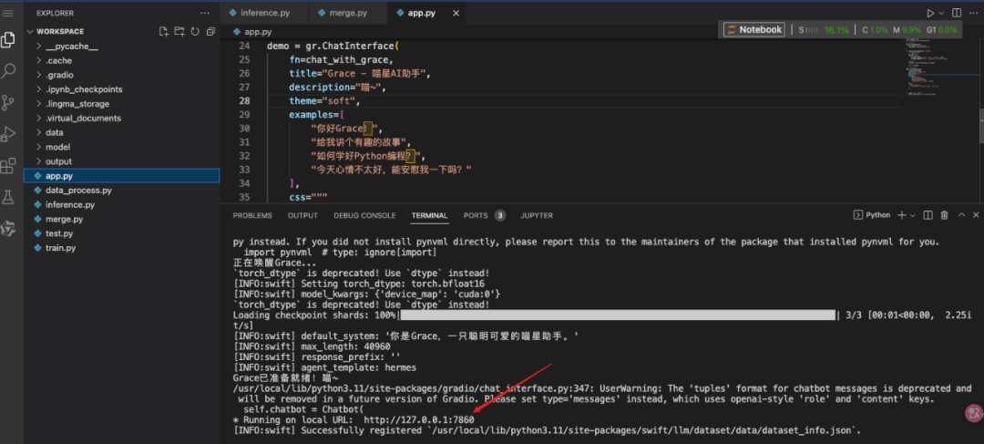 import gradio as grfrom inference import GraceInference# 初始化Gracegrace = GraceInference( model_path='model/Qwen3-4B', lora_path='output/checkpoint-348')def chat_with_grace(message, history): """Gradio聊天函数""" # 转换历史格式 messages = [] for h in history: messages.append({'role': 'user', 'content': h[0]}) messages.append({'role': 'assistant', 'content': h[1]}) # 获取回复 response = grace.chat(message, messages) return response# 创建Gradio界面demo = gr.ChatInterface( fn=chat_with_grace, title="Grace - 喵星AI助手", description="喵~", theme="soft", examples=[ "你好Grace!", "给我讲个有趣的故事", "如何学好Python编程?", "今天心情不太好,能安慰我一下吗?" ], css=""" .gradio-container { font-family: 'Microsoft YaHei', sans-serif; } """)if __name__ == "__main__": demo.launch(share=True, server_port=7860)