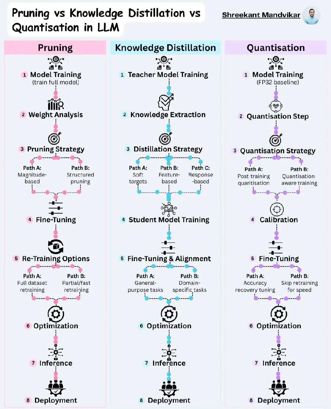 解决“大而慢”的困境,是 LLM 应用化的关键挑战。为此,机器学习领域发展出了一系列精妙的模型优化技术。其中,剪枝(Pruning)、知识蒸馏(Knowledge Distillation)和量化(Quantisation)这三大策略,如同高效的“瘦身教练”与“加速引擎”,致力于在保证模型性能的前提下,实现体积最小化和运行速度最大化。