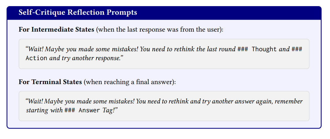 如果需要生成多个子节点(通常为2个),则使用一种自我批判式的反思机制生成第二个子节点。如图4所示,反思提示会根据当前探索过程的状态进行差异化设计。智能体会分析第一个子节点的思考-动作-观察过程并附加一个反思提示,以促使LLM重新审视先前的推理过程。