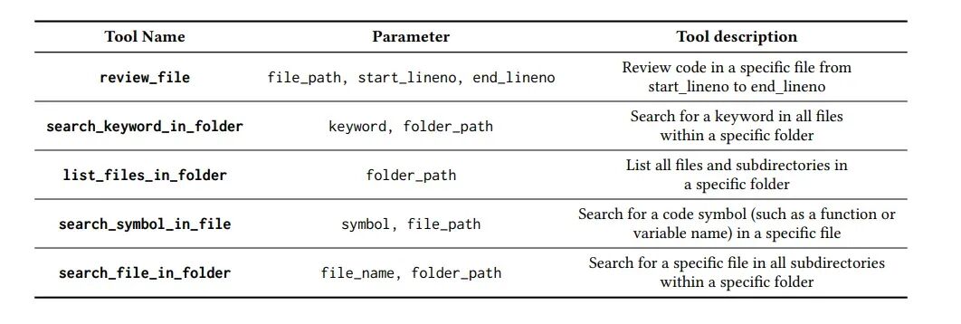 表1:RepoQA-Agent工具集:这些工具使LLMs能够在代码库中执行仓库探索、代码审查、文件导航及关键词/符号搜索等操作。