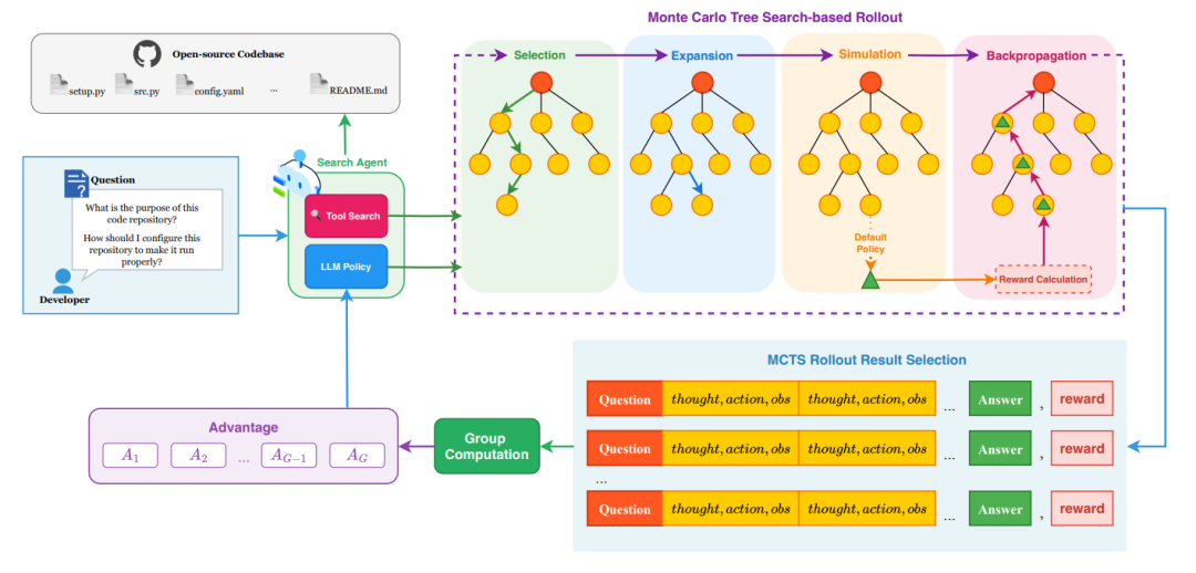 如图3所示,RepoSearch-R1 的训练流程主要包含MCTS引导的轨迹生成、轨迹选择与奖励计算、优势计算与GRPO训练三个阶段。