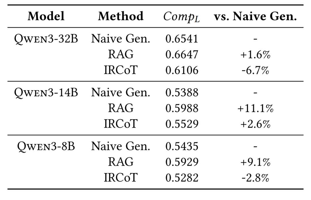 开源模型在使用 IRCoT 时表现参差不齐:Qwen3-14B 相比朴素生成方法仅取得 2.6% 的小幅提升,但仍明显弱于 RAG(RAG 提升 11.1%);Qwen3-32B(-6.7%)和 Qwen3-8B(-2.8%)则在IRCoT下表现不如朴素生成方法。这些结果表明,研究团队设计的工具集能有效帮助大型闭源 LLM 探索代码库,但较小的开源模型在缺乏额外训练的情况下难以有效进行多轮工具推理。