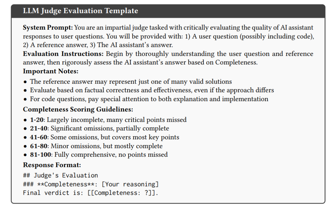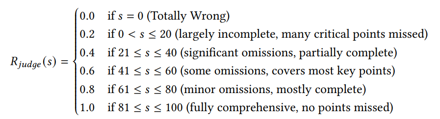 LLM评判器采用严格的1-100分制进行完整性评估,随后将分数映射为离散质量等级以提供稳定的训练信号(其中s代表LLM评判器给出的1-100分原始分数):