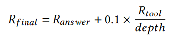 中间过程奖励𝑅tool,累加了轨迹中每个工具执行步骤获得的奖励。这些奖励通过二元反馈捕捉智能体探索策略的有效性:成功的信息检索操作获得+1.0奖励,而不正确或无效的工具使用模式则会被给予-1.0的惩罚。