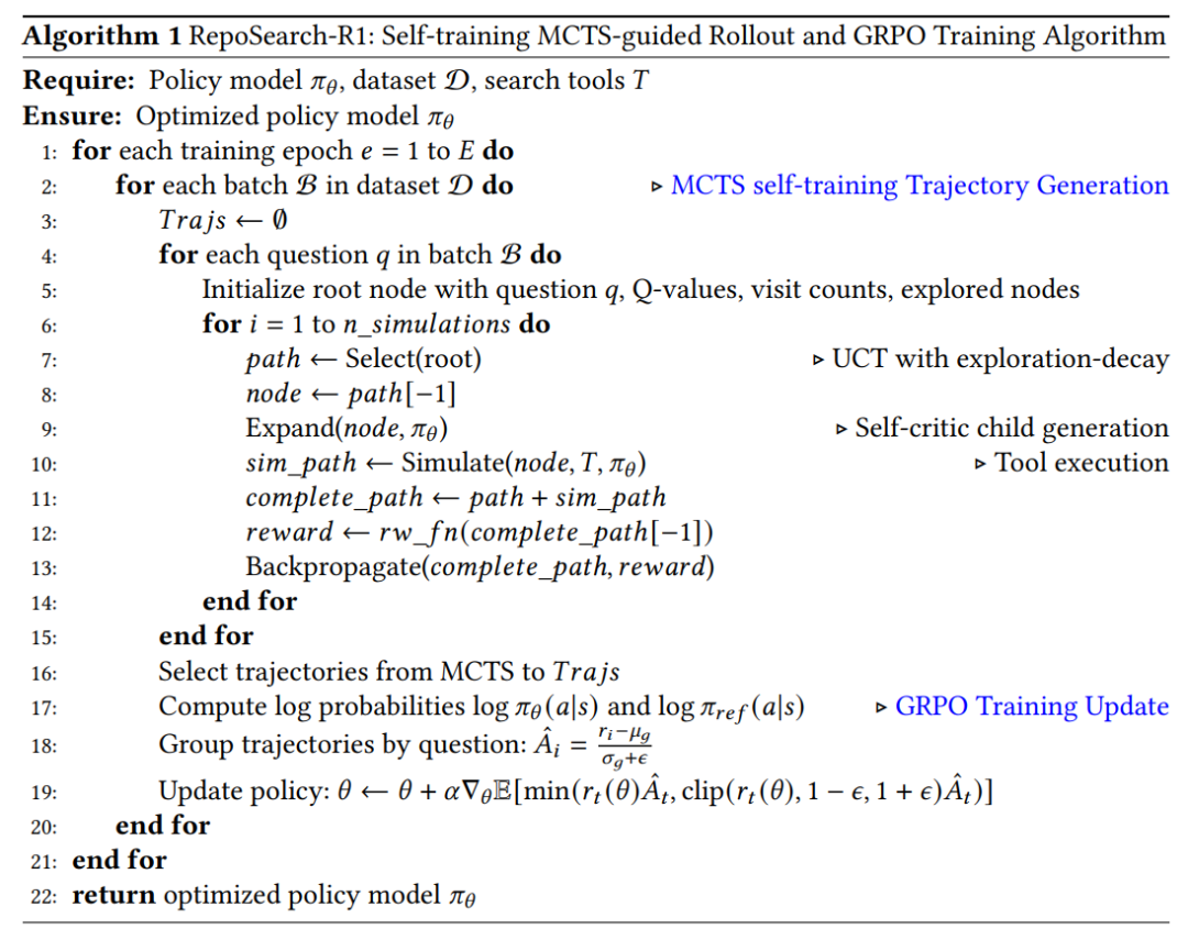 如算法1所述,MCTS引导的rollout是 RepoSearch-R1框架的关键组成部分。该过程使 RepoQA-Agent 能够借助一组工具,在代码库中系统性地探索多样化的动作序列,以收集信息并做出有依据的决策。MCTS引导的轨迹生成遵循四个连续阶段:
