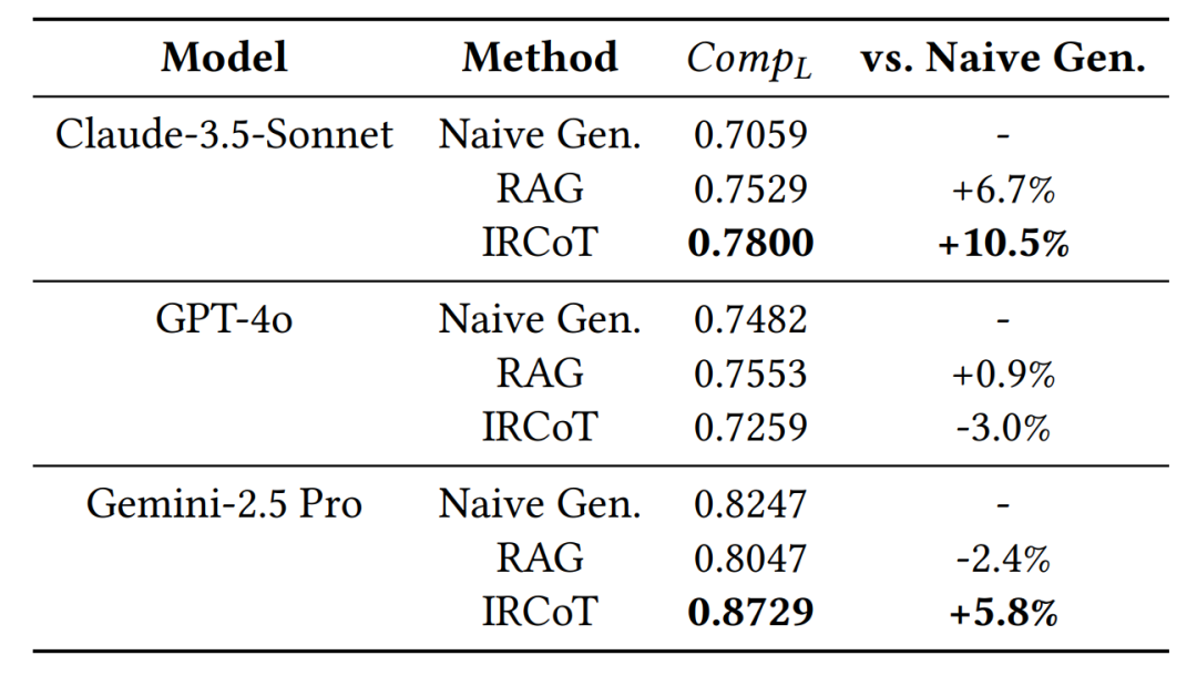 表5、表6展示了闭源与开源LLM的评估结果。对于闭源模型,Claude-3.5-Sonnet和Gemini-2.5-Pro在使用支持多轮工具增强的IRCoT方法时均展现出更强的推理能力。其中,Gemini-2.5-Pro结合IRCoT获得的完整度得分为0.8729,相比朴素生成方法提升了 5.8%;Claude-3.5-Sonnet 的提升更为显著,IRCoT 得分为 0.7800,较朴素生成方法提高了10.5%。相比之下,GPT-4o 在使用 IRCoT 时的问答完整性并未超越RAG,反而比朴素生成方法下降了 3.0%。