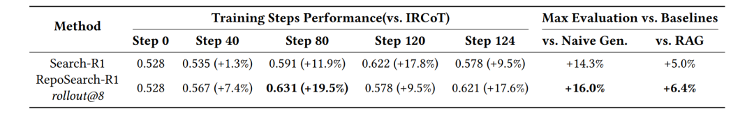 表4:Search-R1与RepoSearch-R1在Qwen3-8B模型上的训练步数及最大评估性能对比。第0步代表强化学习训练前的初始IRCoT基线性能。
