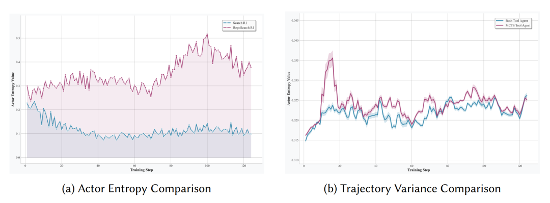 图6:Search-R1 与 RepoSearch-R1 的对比:熵值与轨迹方差分析。