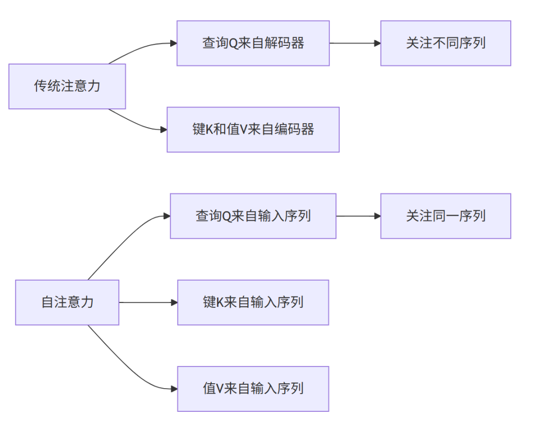 传统注意力机制通常用于编码器-解码器架构,让解码器在生成每个词时关注编码器的不同部分。而自注意力(Self-Attention)让序列中的每个元素都能够直接关注序列中的所有其他元素,包括自身。