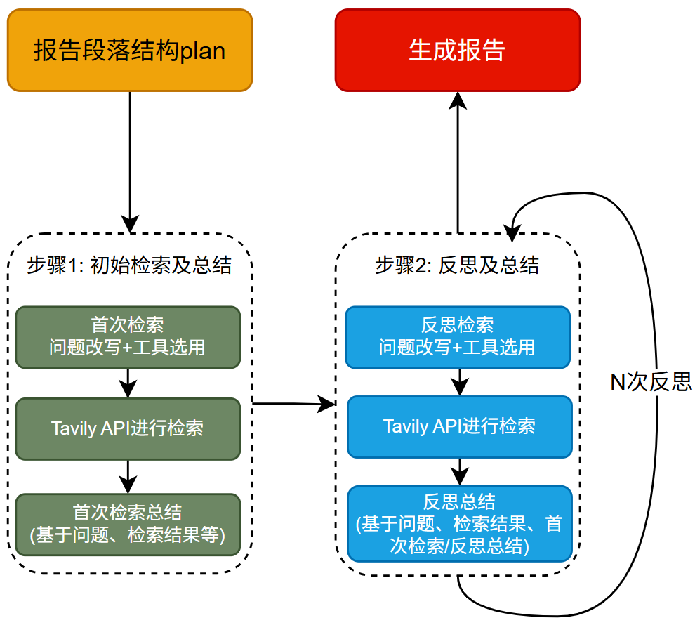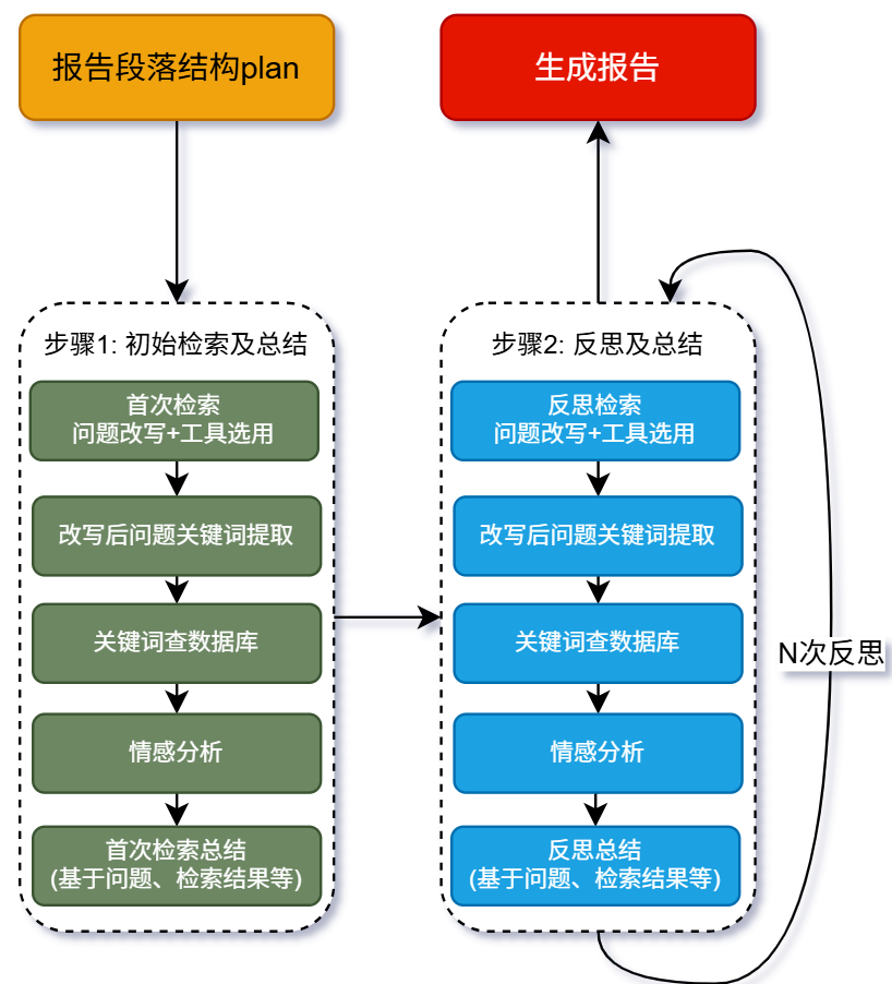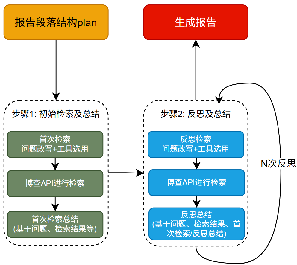 整体执行流程与初始检索并总结的流程大体相同,不同之处在于反思检索的输入除了title和content外,还有最新的段落总结(第一次是首次检索后的总结,后续是前次反思迭代后的总结)作为输入。