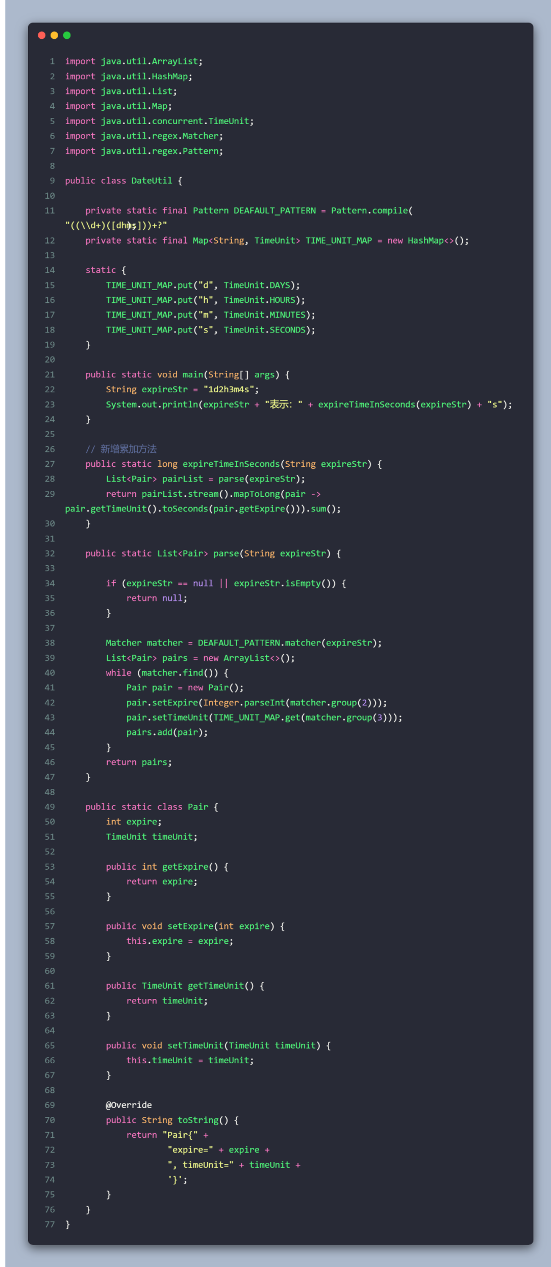 首先应该定义字符串格式,本人定义的解析格式为: 1d2h3m4s。其中数字后面字母的含义为: