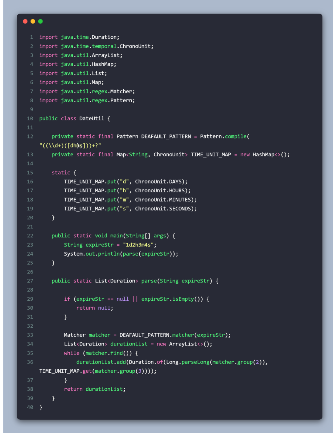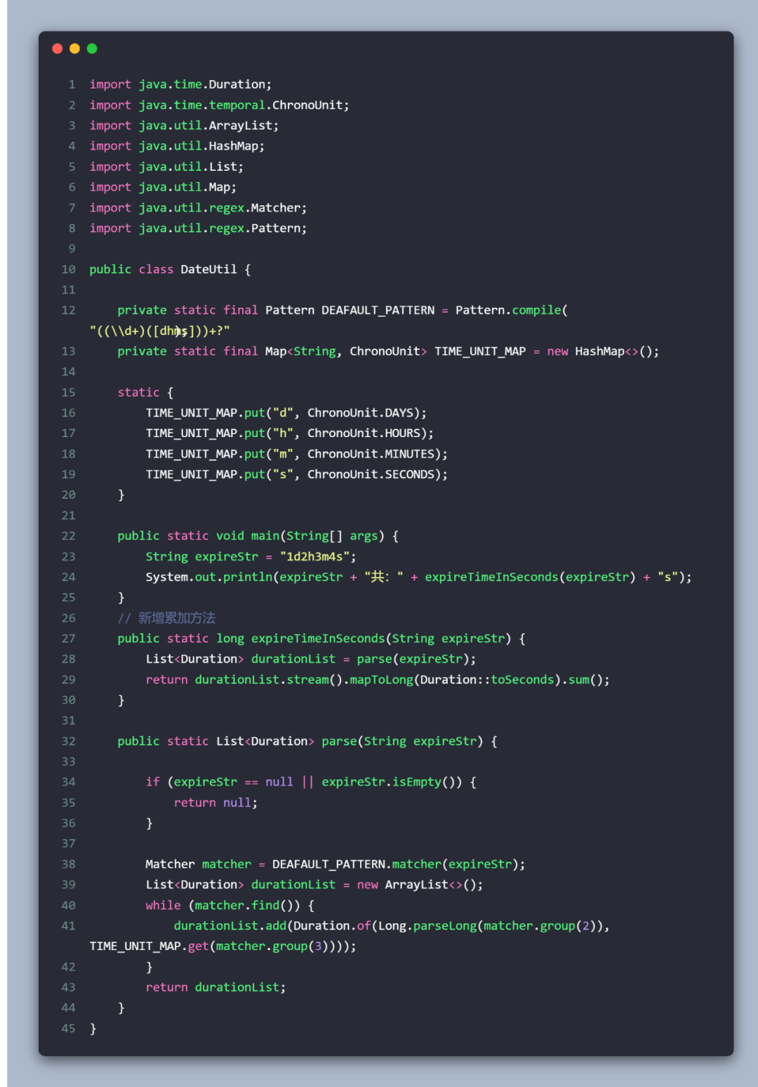 在日常开发中,经常会遇到这么一个场景,即通过配置中心设置某个缓存的过期时间,但线上和线下支持的维度却不同。比如正常而言,线上的过期时间以天为维度,而线下为了方便测试,可能得以秒或分为单位。当然,水无常势,法无定则,可以用两个配置来区分环境。但个人感觉那么做有点不那么优雅。所以苦思良久,终于琢磨出一个根据指定格式字符串来解析获取指定时长的方法。
