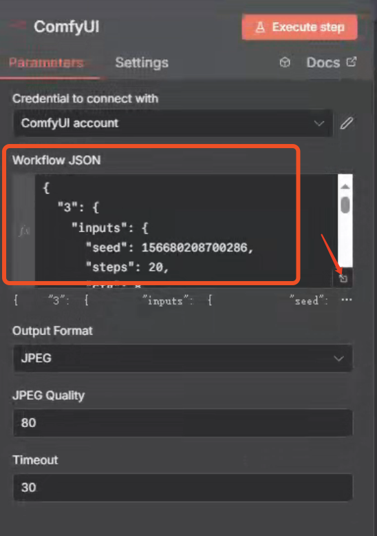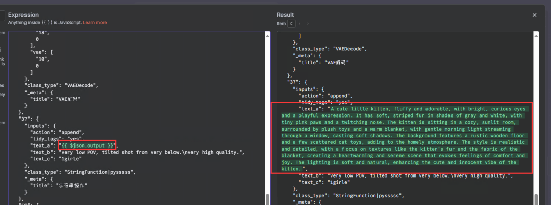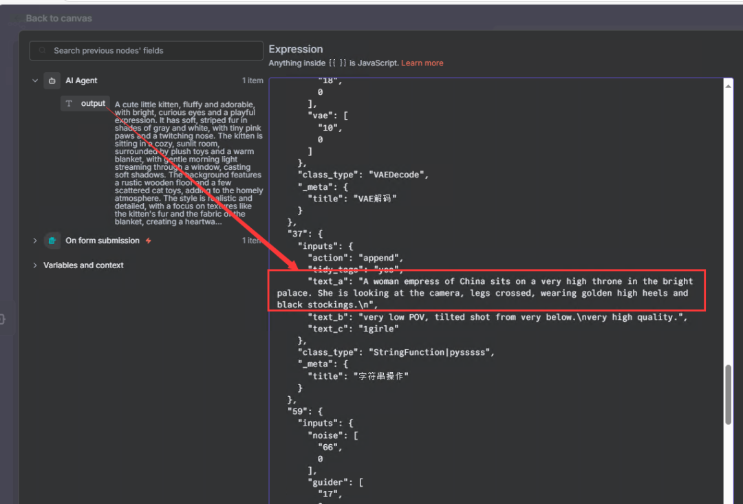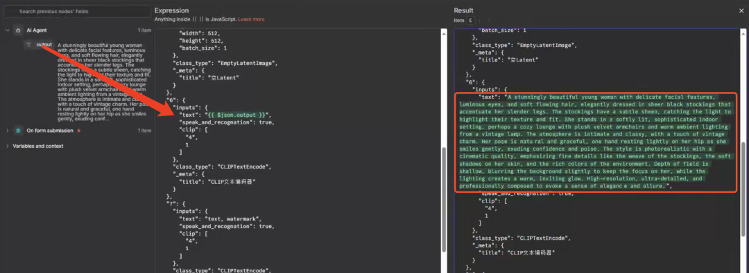 同样把 comfyui 工作流 导出 api 的 json 内容复制到 n8n 的 comfyui 节点,找到需要替换的提示词部分,然后把提示词删掉,从前一个节点把提示词拖拽过来。