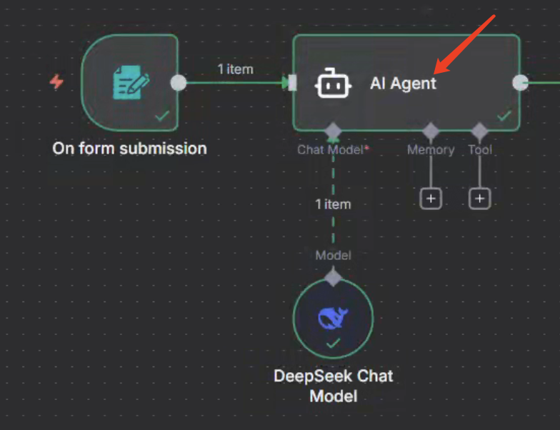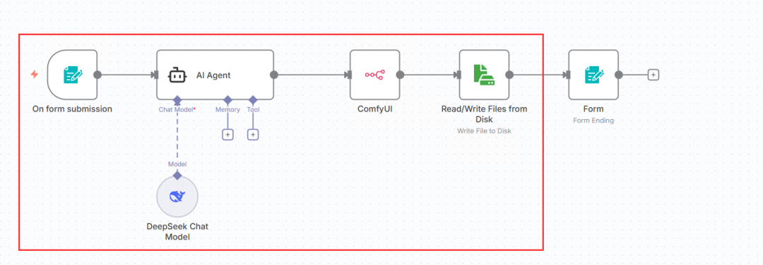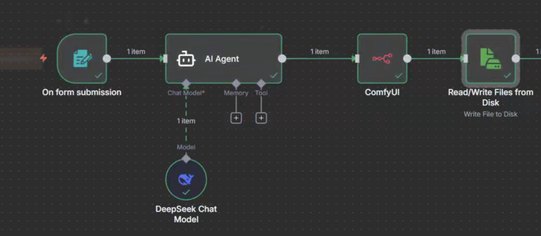 由于我们不需要记忆功能,也不需要它再去完成其他操作,只是简单的输出一个提示词给 comfyui 的节点用就可以了,所以我这里 memory 和 tools 两个子节点都没连。