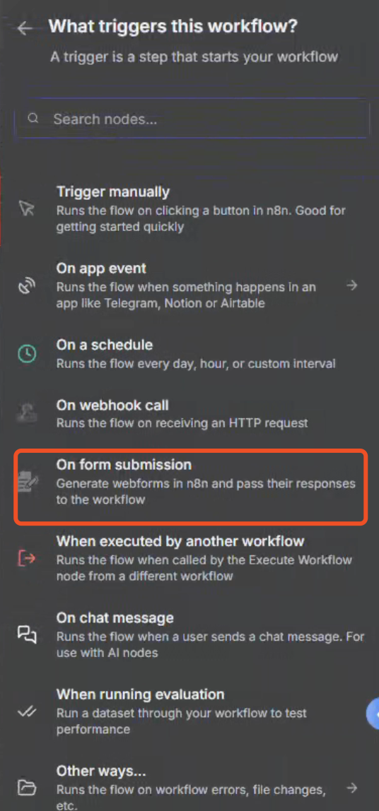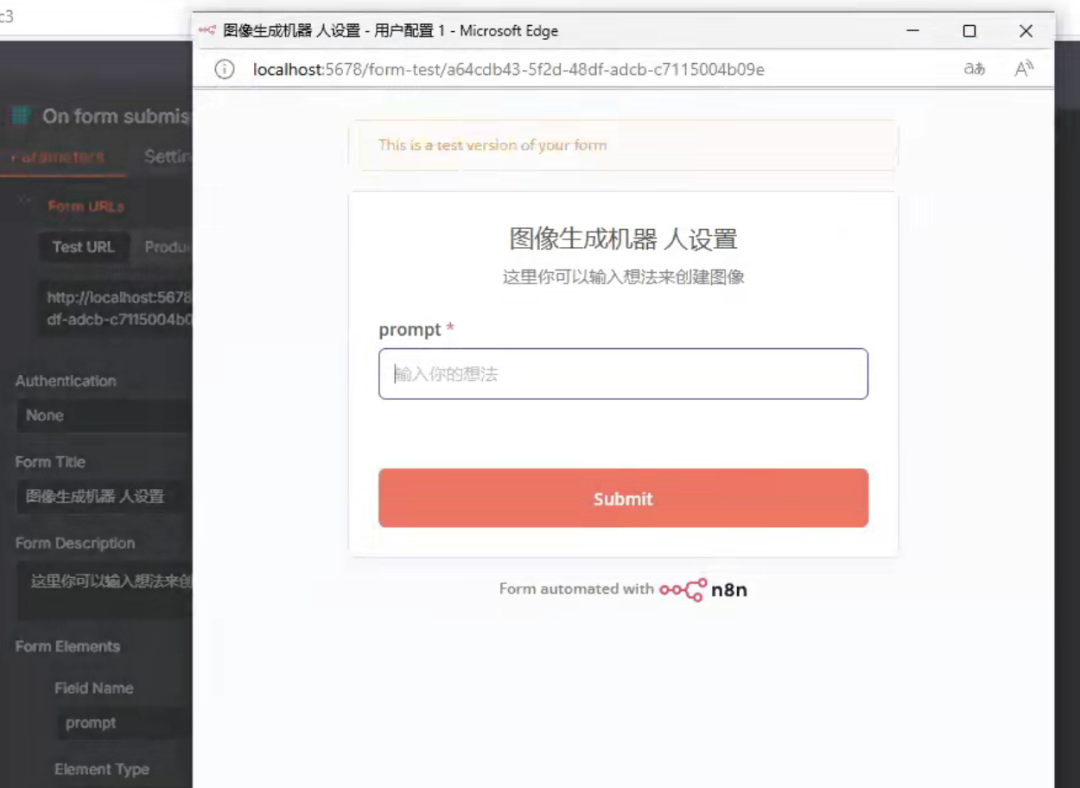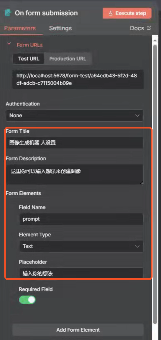 触发节点我选择表单触发,让用户提交一个表单去生成他想要生成的图片创意,也可以选择聊天的对话框触发。