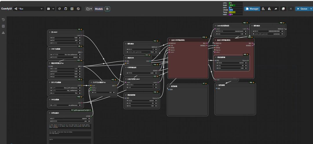 之前生成的图片比较丑,我们替换一下之前比较简陋的工作流,替换一个我已经搭建好的用到了 flux 模型的工作流。看节点数量就能看出来比默认的工作流复杂,关键是里面用到的模型不一样了。