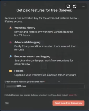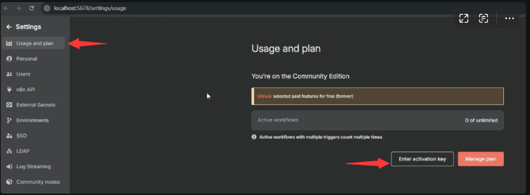 然后就是把邮箱收到的激活码复制一下,到 n8n 的设置,使用和计划里面去输入激活码进行激活。