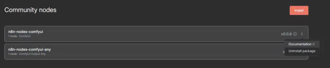 安装好之后就可以在这个列表里面看到了,点击每个插件右上角的三个点,可以查看对应节点的文档,或者是卸载插件。