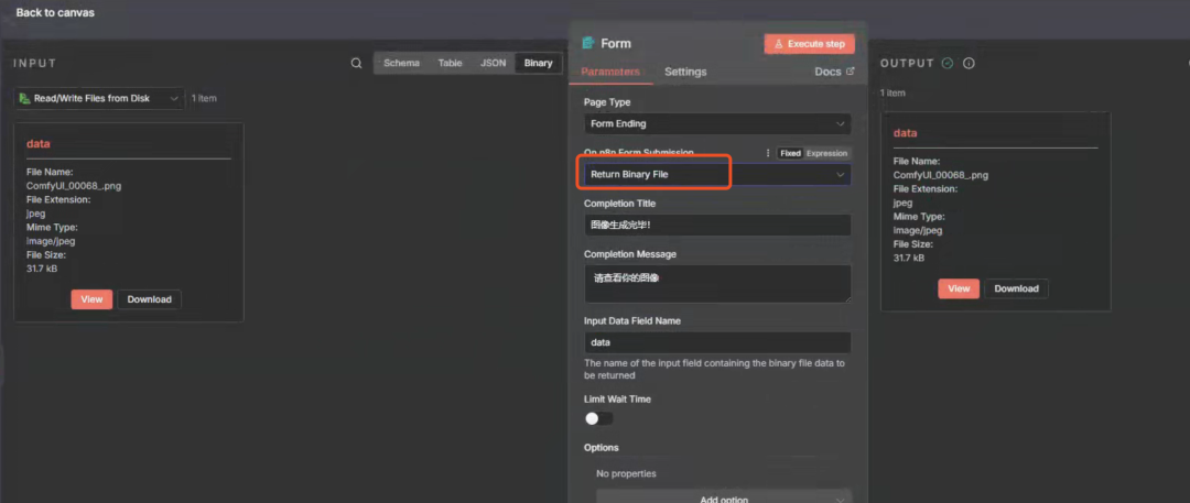 带着这个疑问,打开这个节点设置,之前我选的是返回二进制文件,我猜可能是它接管了前一个节点的写入磁盘,没有写入到我们设定的 E 盘,而是一个默认的下载路径。