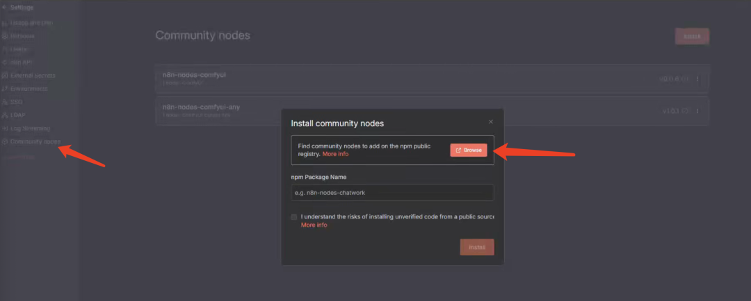 点击这个按钮可以浏览所有的插件,可以通过搜索自己想要的插件 ,把插件的名字复制下来:比如我们需要安装的插件是 n8n-nodes-comfyui,然后点击安装。