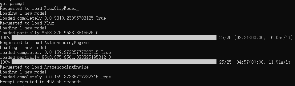这里有一个点要特别注意,因为 flux 的模型一个就有 22G,所以这个工作流跑起来比较耗时,我的 3060 的显卡跑一次就耗时 492.55 秒!!如果你的显卡更差的话,可能时间就更长了。