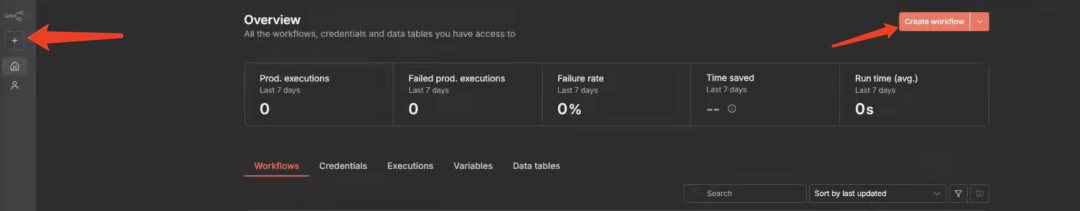 创建工作流可以在 n8n 的界面左上角或者右上角按钮处点击创建。